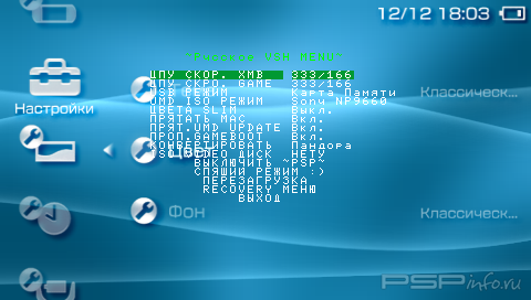 Название: Ultimate VSH Menu Final Версия: PSP Год выхода: 2010 Тип: Plugin Прошивка: 5.00 М33-X; 5.03 GEN-X; 5.50 GEN-X Размер: 32.4 Кб Описание: Финальная версия расширенного vsh-меню, переведенного камрадом MovexxИзменения: - ЦВЕТА SLIM – позволяет пользоваться дополнительными цветами фона от Slim на Fat - ПРЯТАТЬ МАС – скрывать MAC адрес в свойствах о системе - ПРЯТ. UMD UPDATE – скрывать значок обновления прошивки с UMD - ПРОП. GAMEBOOT – пропускать показ gameboot`а (экономит примерно 4 с) - КОНВЕРТИРОВАТЬ